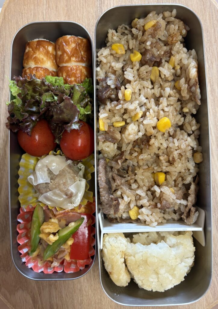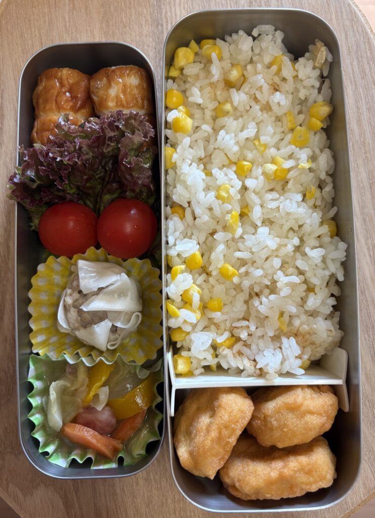 この日のメインは市販のシュウマイとソーセージなどの炒め物とナゲットでした。なお、ごはんは前日のとうもろこしご飯の残りです。