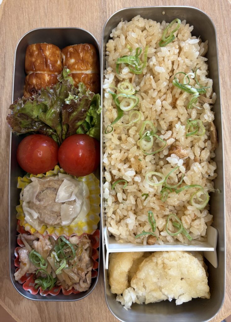 この日のメインは市販のシュウマイと豚肉の炒め物でした。ごはんはツナと油揚げの炊き込みご飯にしたのでその残りです。ねぎが余っていたのでまぶしました。笑