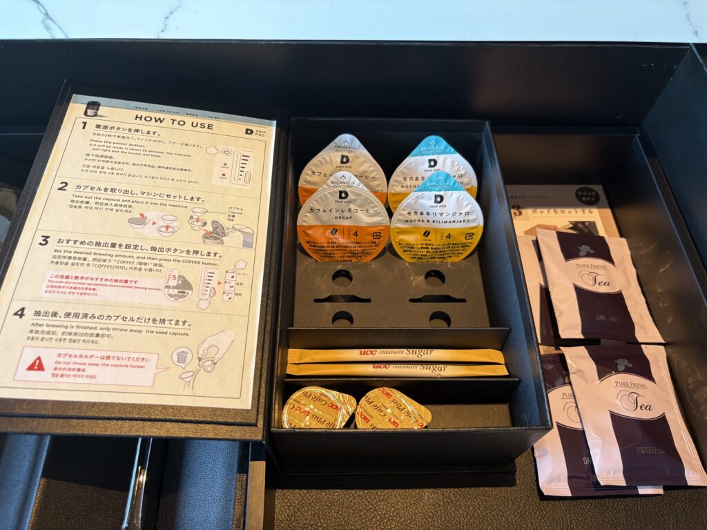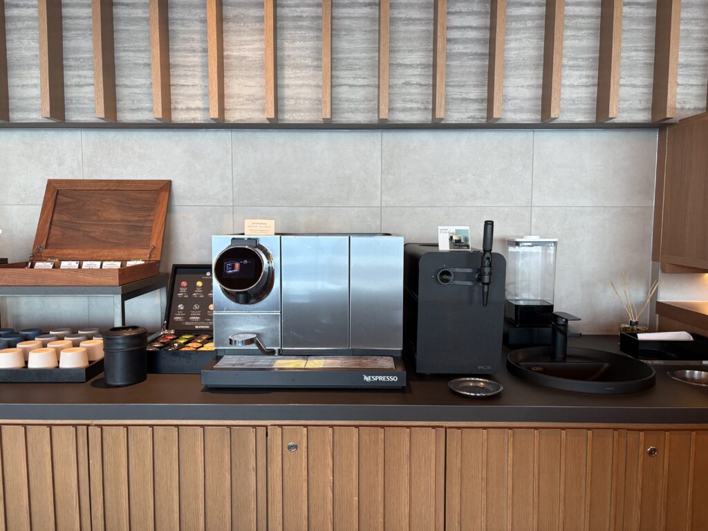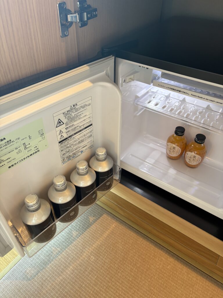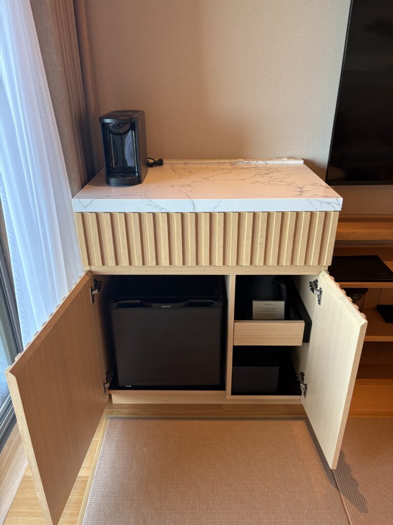 テレビの横にミニバーがありました。アルコールはラウンジにあったので冷蔵庫にはソフトドリンクのみでしたが、ホットドリンクはおおむねそろっていました。