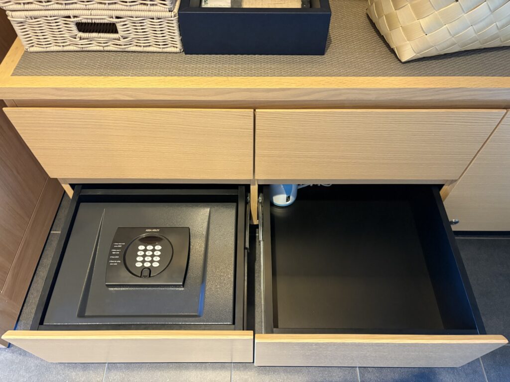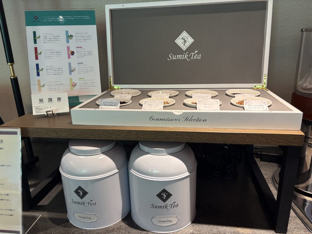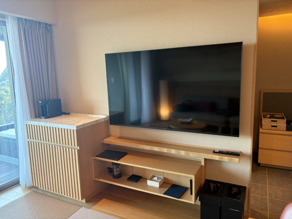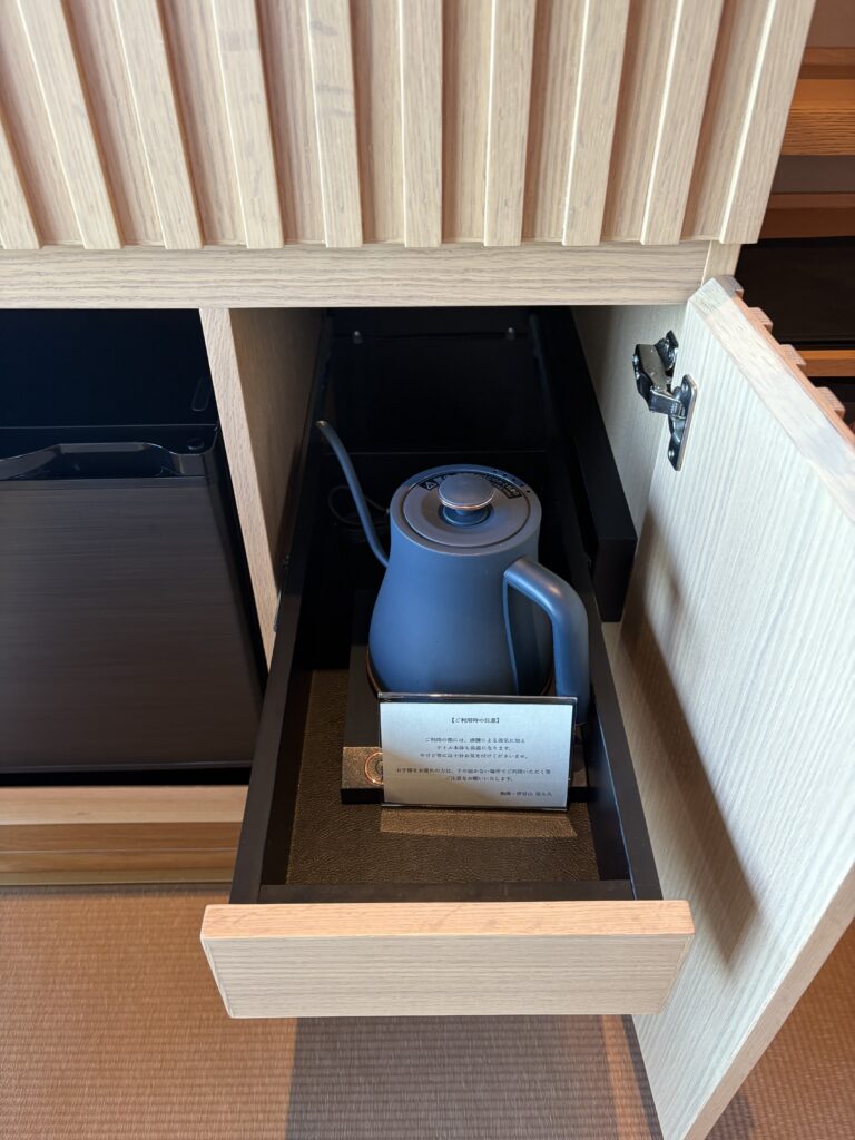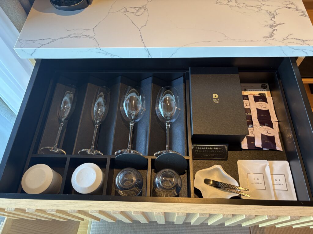 テレビの横にミニバーがありました。アルコールはラウンジにあったので冷蔵庫にはソフトドリンクのみでしたが、ホットドリンクはおおむねそろっていました。
