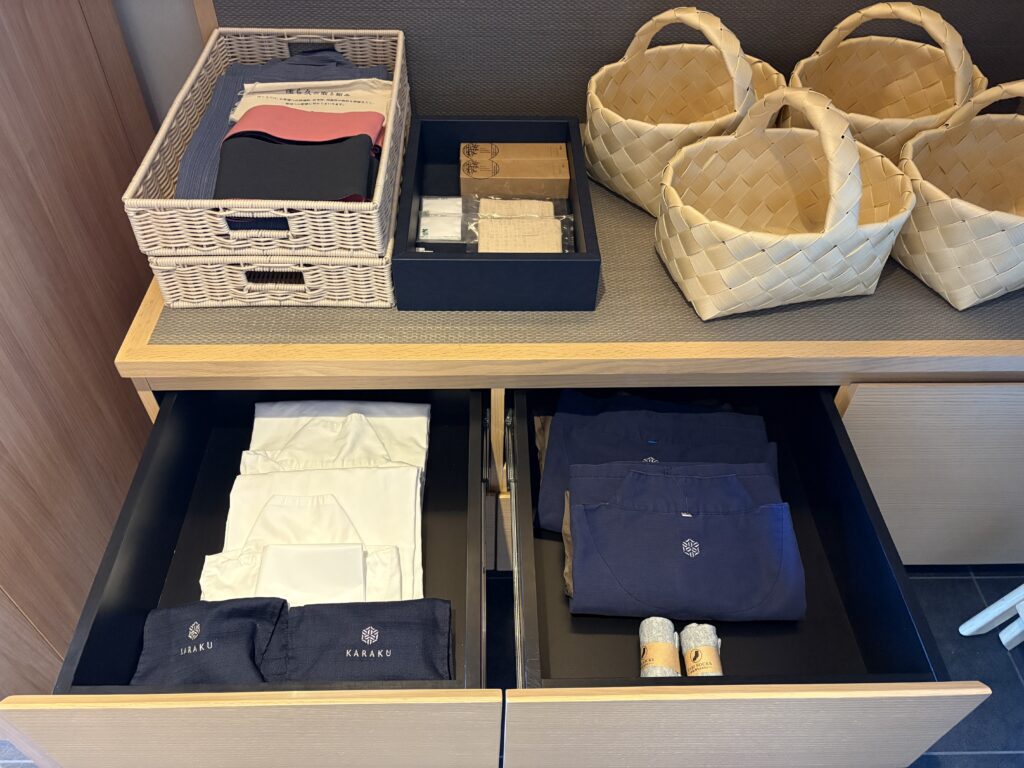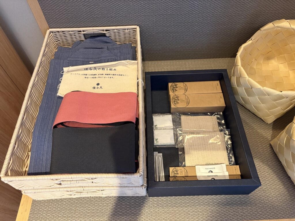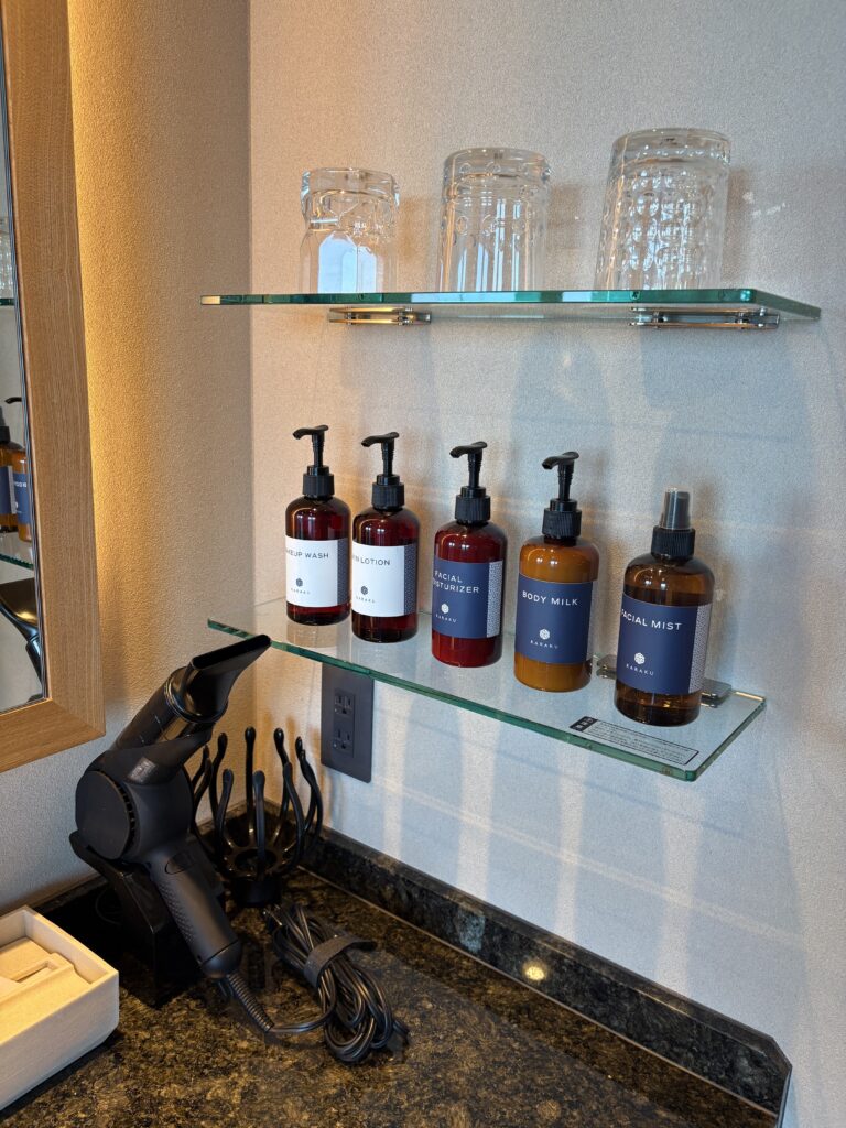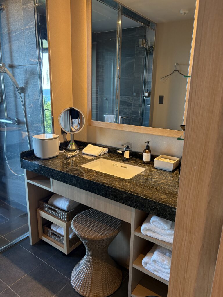 水周りです。タオル、アメニティはおおむねそろっていました。ただ、箱根と同じくヘアゴムとシャワーキャップはありませんでした。