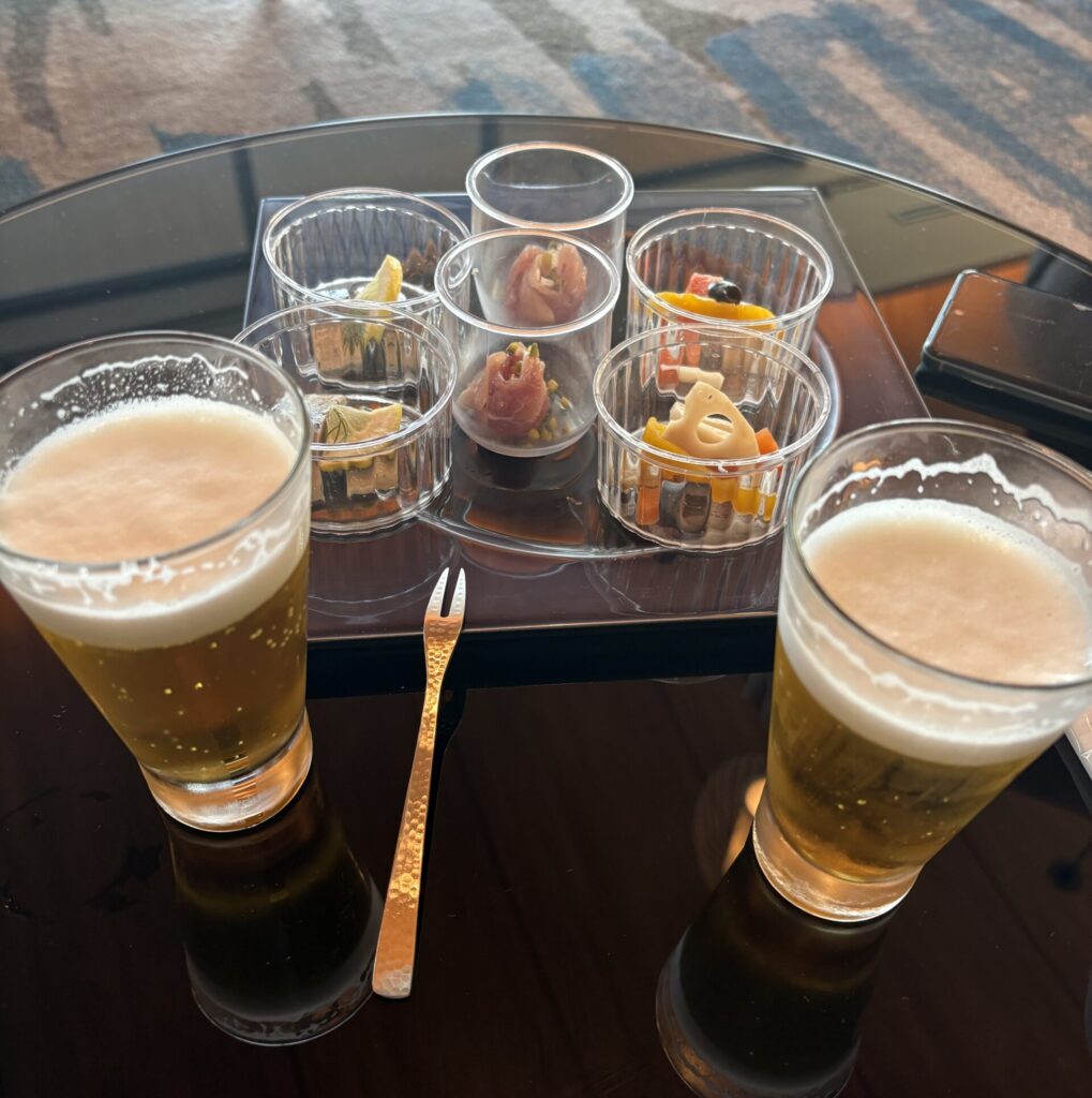 まずはビールとおつまみで乾杯しました。この時間をとても楽しみにしていたので、本当に至福のひとときでした。写真を撮るのを失念しましたが、私はこのあとスパークリングワインと白ワインもいただき、おつまみもおかわりしました。笑