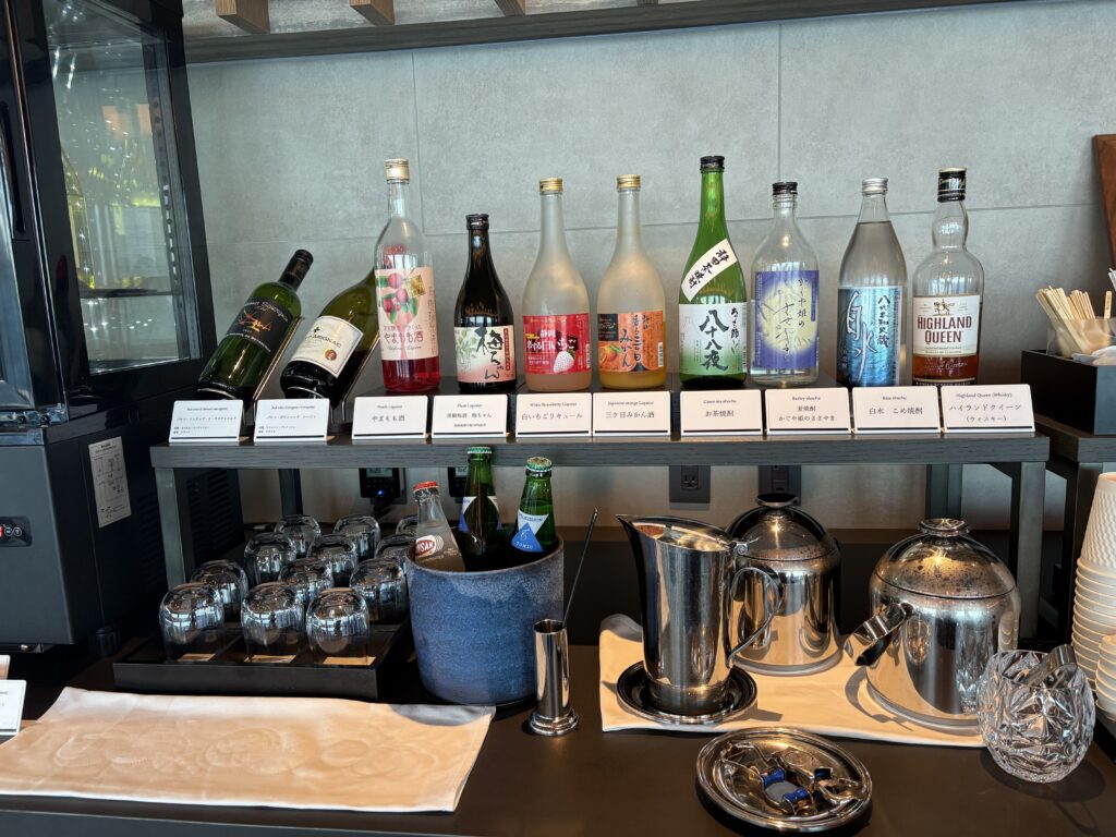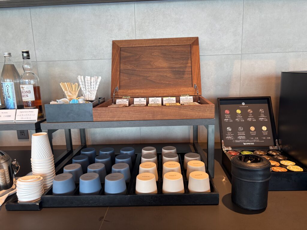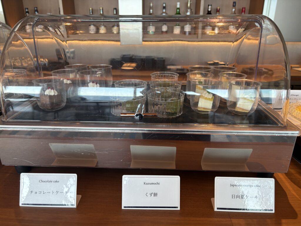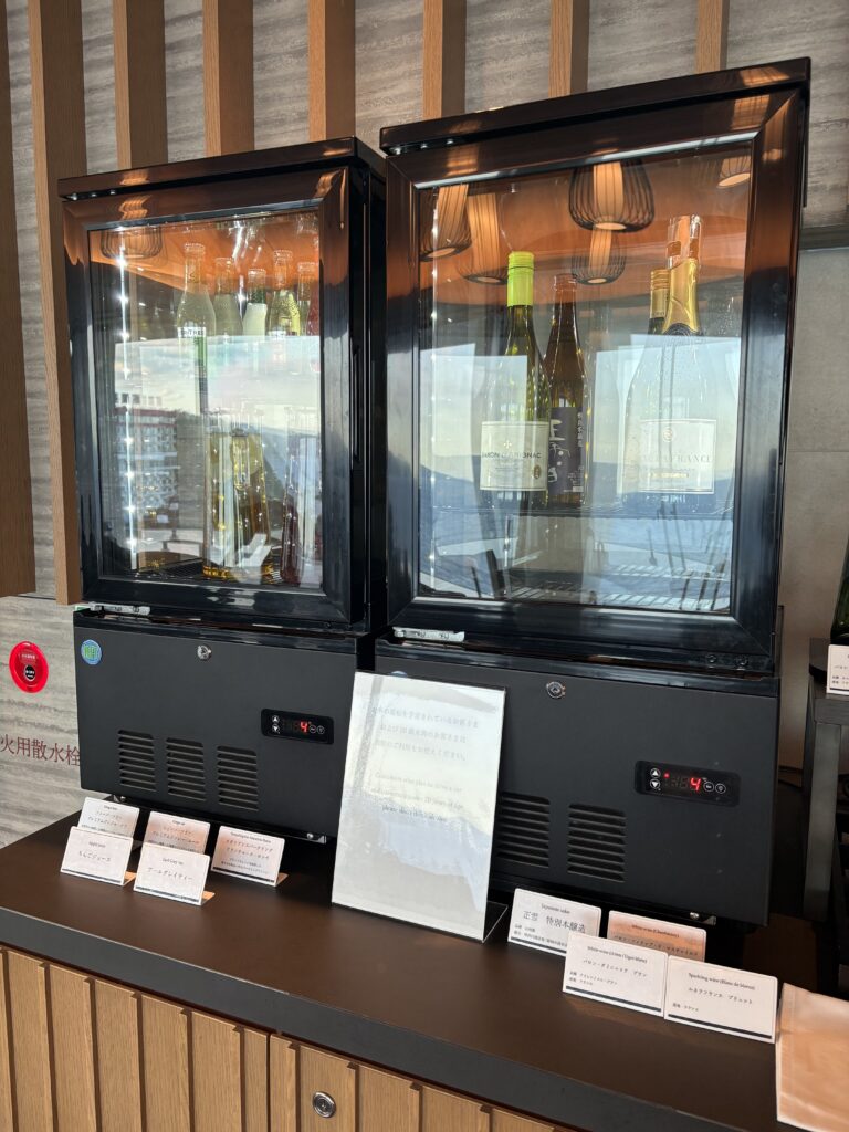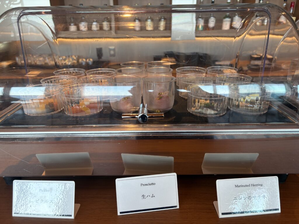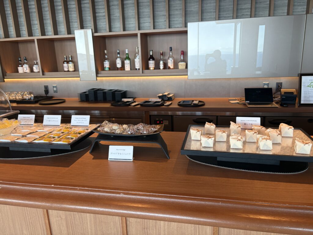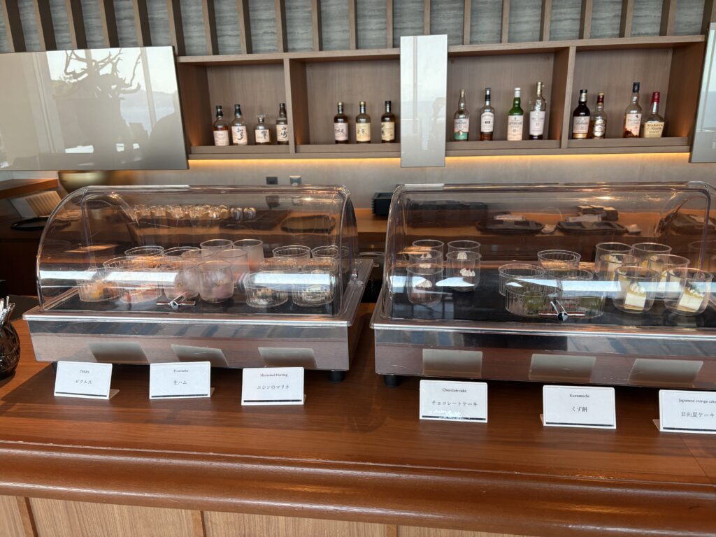 前後しますが、いったん客室に荷物を置いてから再度ラウンジに来ました。各種ドリンクや軽食が充実していました。