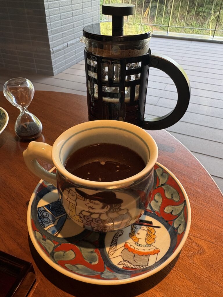 コーヒーの準備ができました。砂時計が落ちたら飲み頃のサインです。